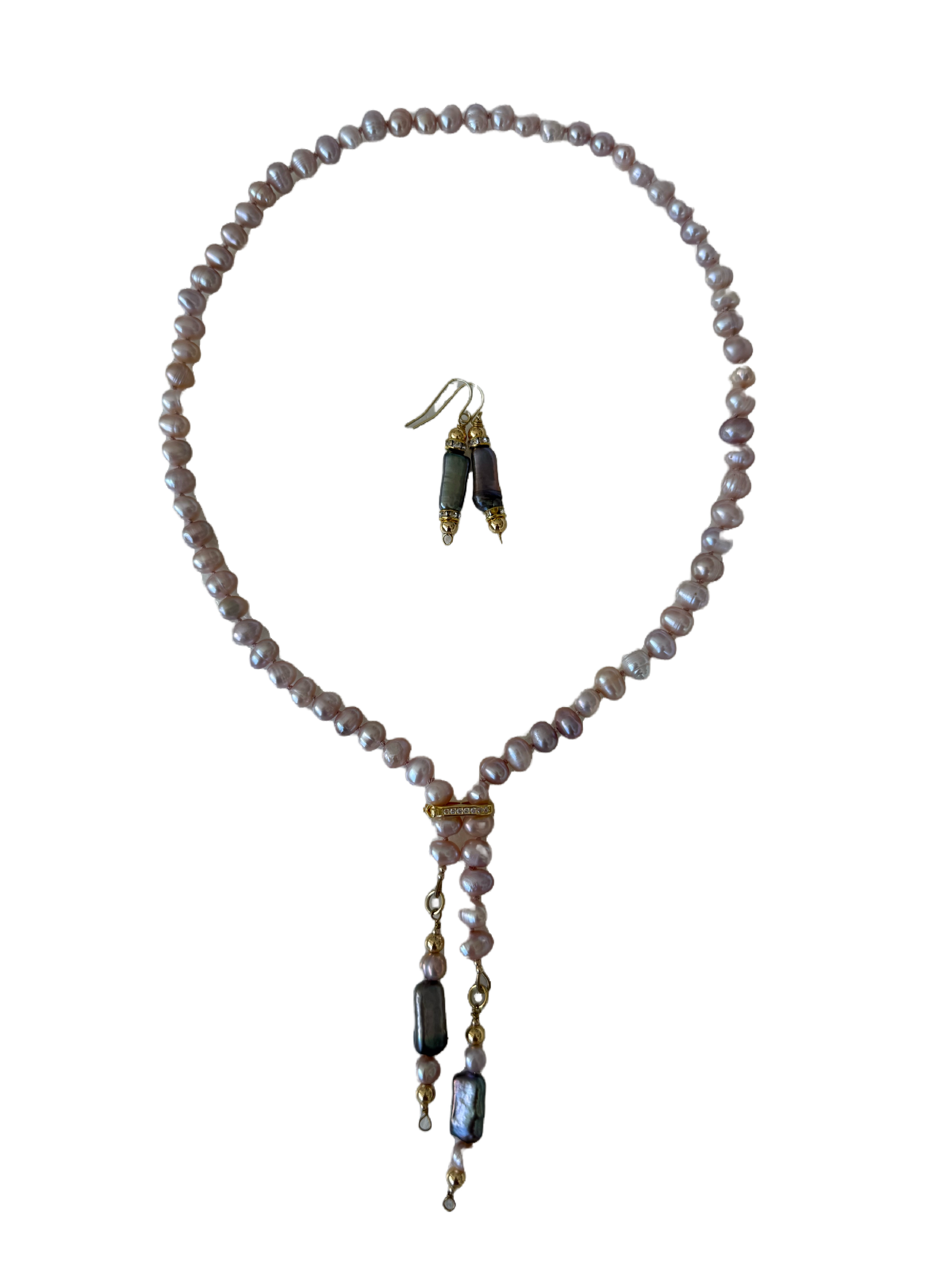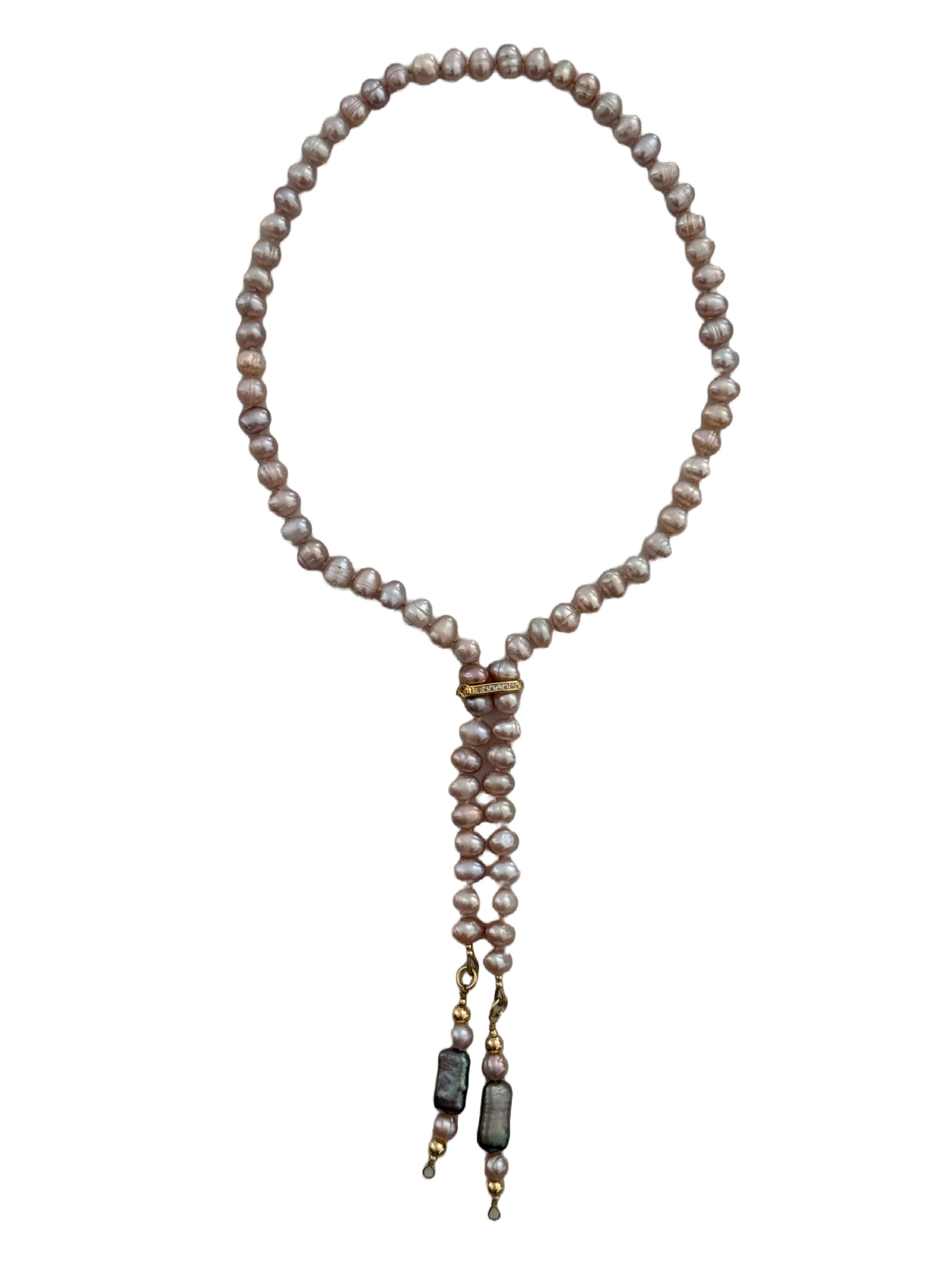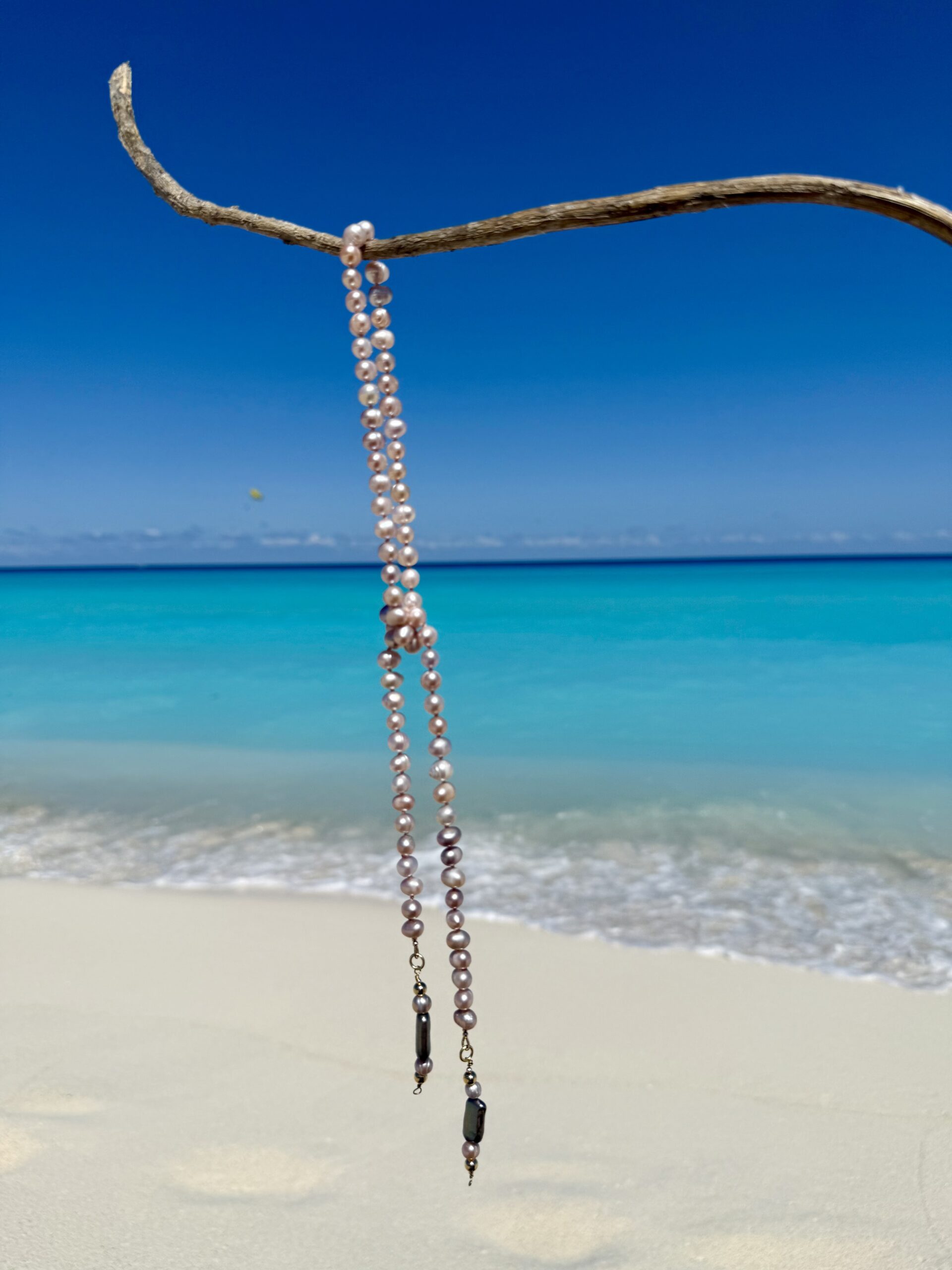 Bathed in the soft hues of ocean light, Sjødis is a flowing strand of luminous light pink freshwater pearls, each one kissed by shades of blush, rose, and dusk. The necklace finishes with elegant dark pearls—delicate yet bold—dangling like drops of ink meeting the sea.