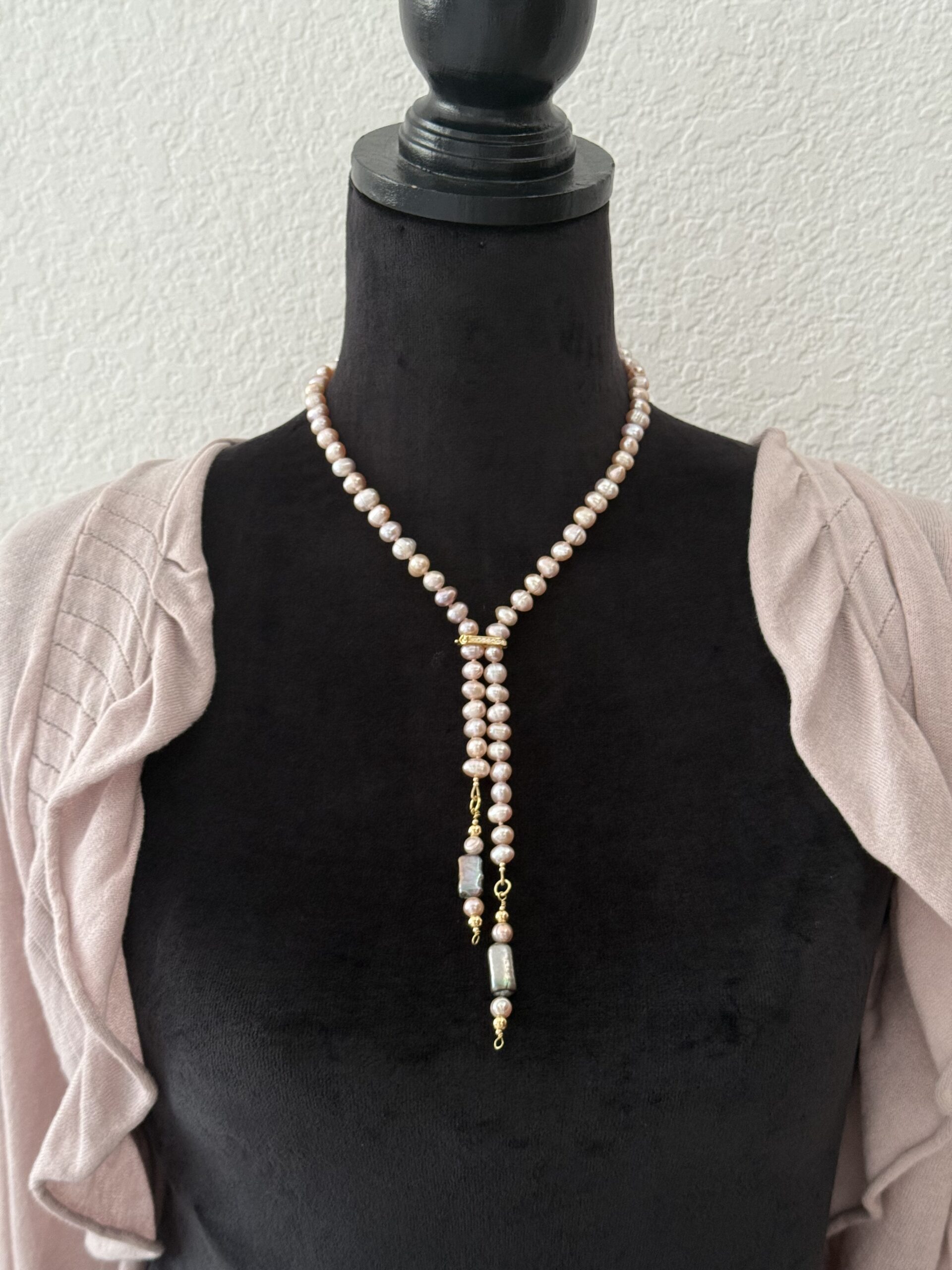 • Blush freshwater pearls, handknotted on pink toned silk cord